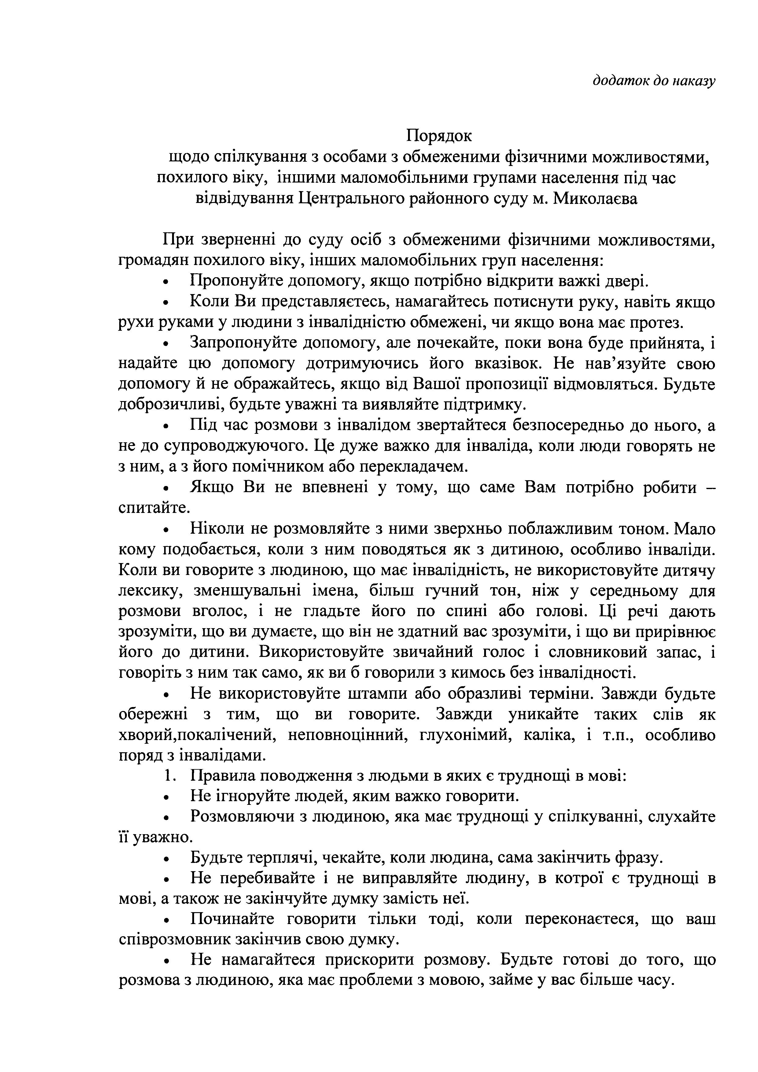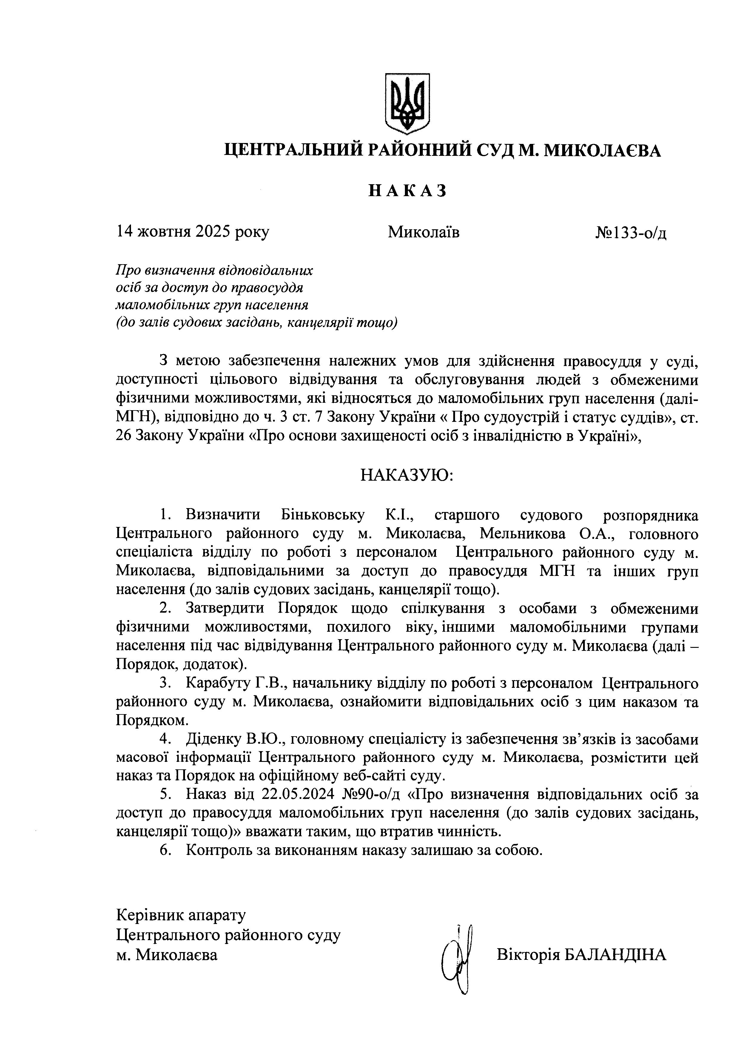 Про визначення відповідальних осіб за доступ до правосуддя маломобільних груп населення від 14.10.2025 року та Порядок виконання